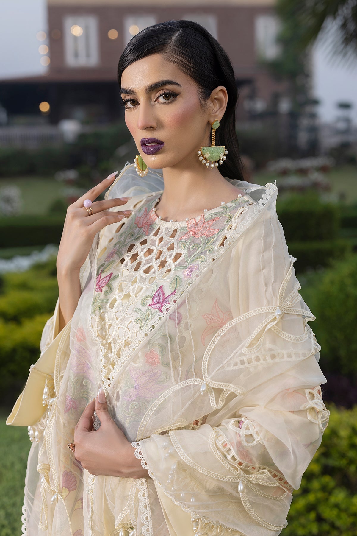 • Embroidered Border on Organza with punching pearls